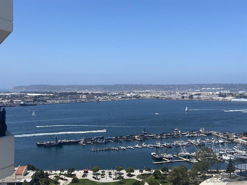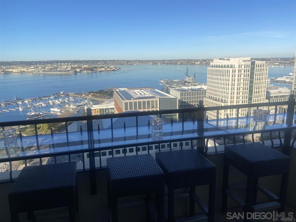 PARK PLACE! Top of the stack (25th floor) with expansive harbor views high above Embassy Suites hotel. Split en-suite bedrooms with lots of designer upgrades! Newer kitchen and bathroom cabinetry. Custom wine bar & media center. Tile mosaic gas fireplace. Extensive AV system with flat screens in living room and bedrooms convey. Two patios off living room and master bedroom. Custom integrated bar top dining on 10x10 patio conveys. Rare side by side parking with large storage unit. Condo can be sold furnished.